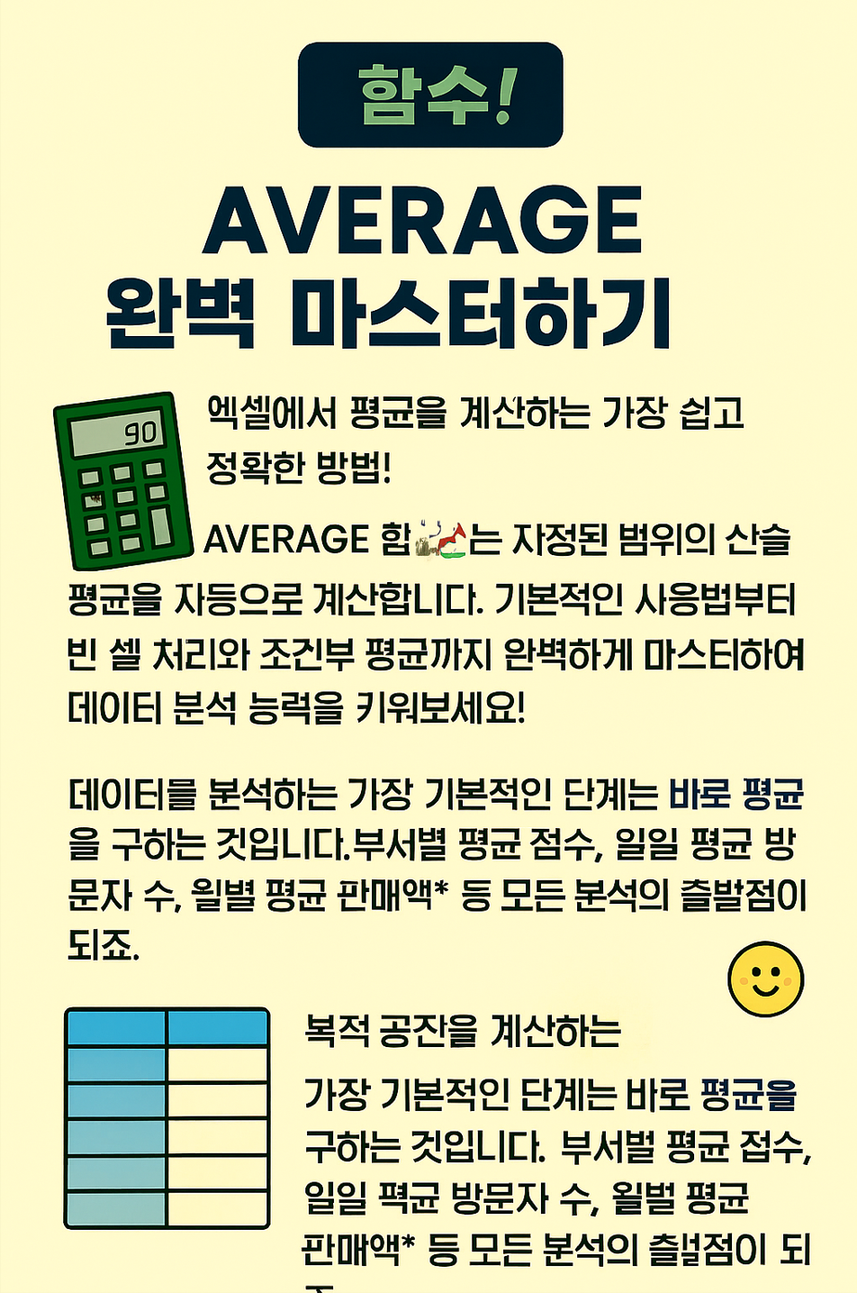 데이터를 분석하는 가장 기본적인 단계는 바로 평균을 구하는 것입니다. 부서별 평균 점수, 일일 평균 방문자 수, 월별 평균 판매액 등 모든 분석의 출발점이 되죠. 📊