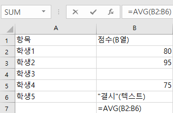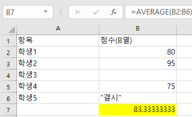AVERAGE 함수는 B4의 빈 셀과 B6의 "결시" 텍스트를 무시합니다. 따라서 80, 95, 75 세 개의 숫자만 계산합니다.