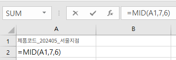 수식: =MID(A1, 7, 6)