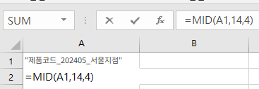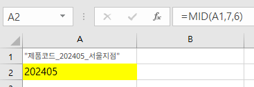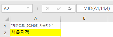 원본 텍스트가 A1 셀에 "제품코드_202405_서울지점"이라고 입력되어 있다고 가정하고 예시를 살펴보겠습니다.