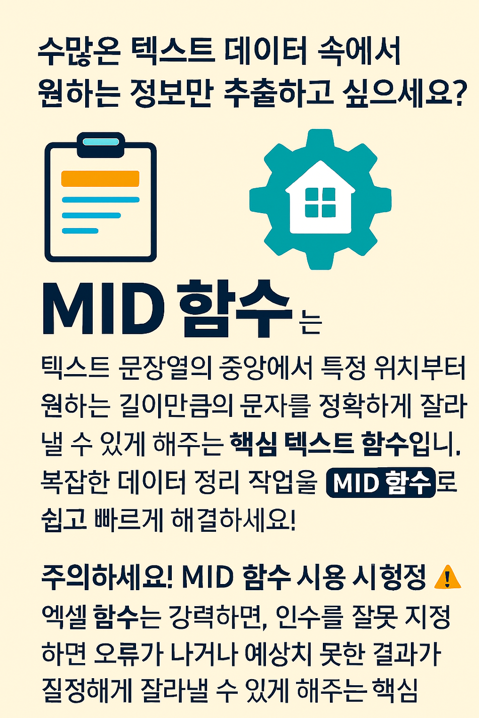 이때 사용하는 것이 바로 MID(Middle) 함수입니다. 문자열의 왼쪽에서 시작 문자를 세어 원하는 위치부터 원하는 개수만큼 문자를 추출하는 이 함수는, 데이터 클리닝과 가공에 필수적인 역할을 합니다. 오늘은 MID 함수의 정확한 문법과 실전 활용법, 그리고 주의사항까지 자세히 알아보겠습니다!