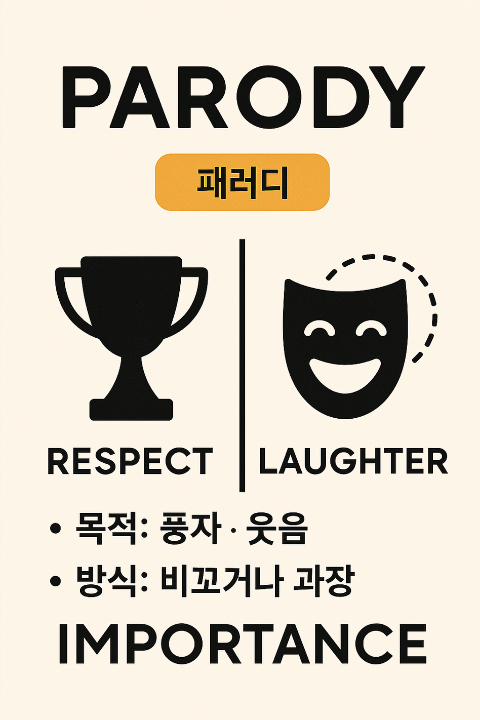 - 키워드: 웃음 (Humor), 풍자, 과장, 모방