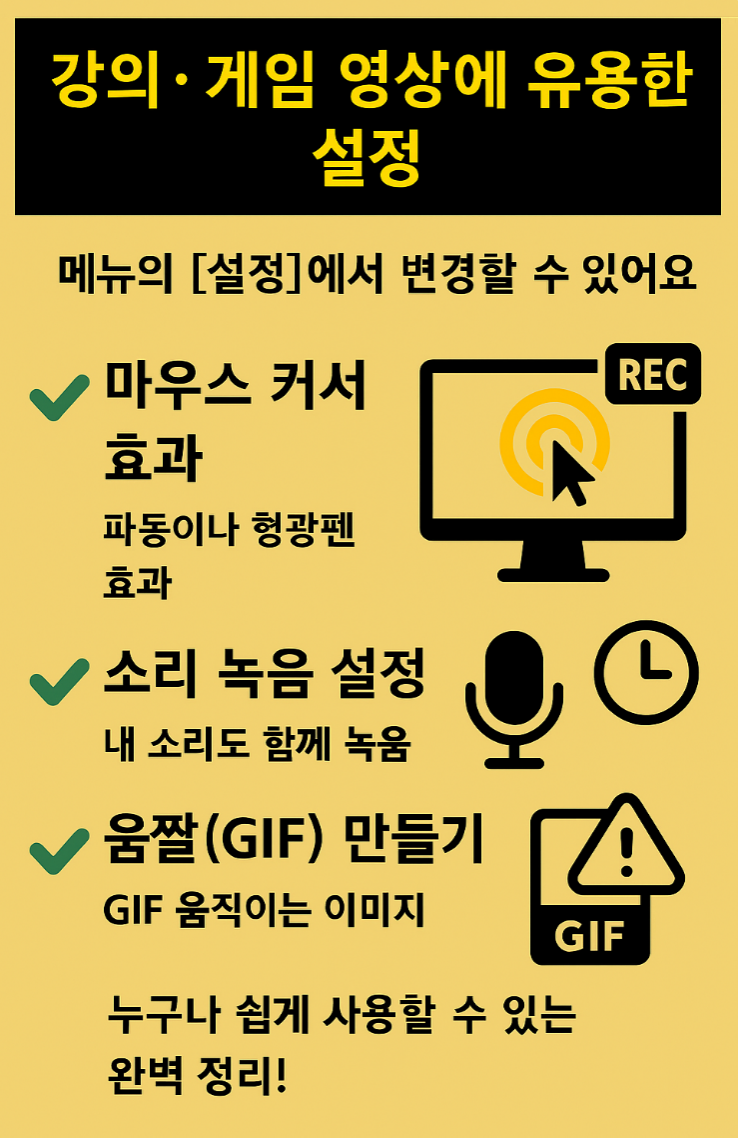 단순 녹화 외에 강의 영상이나 게임 영상을 만들 때 유용한 설정들이에요. 메뉴의 [설정]으로 들어가면 변경할 수 있어요.