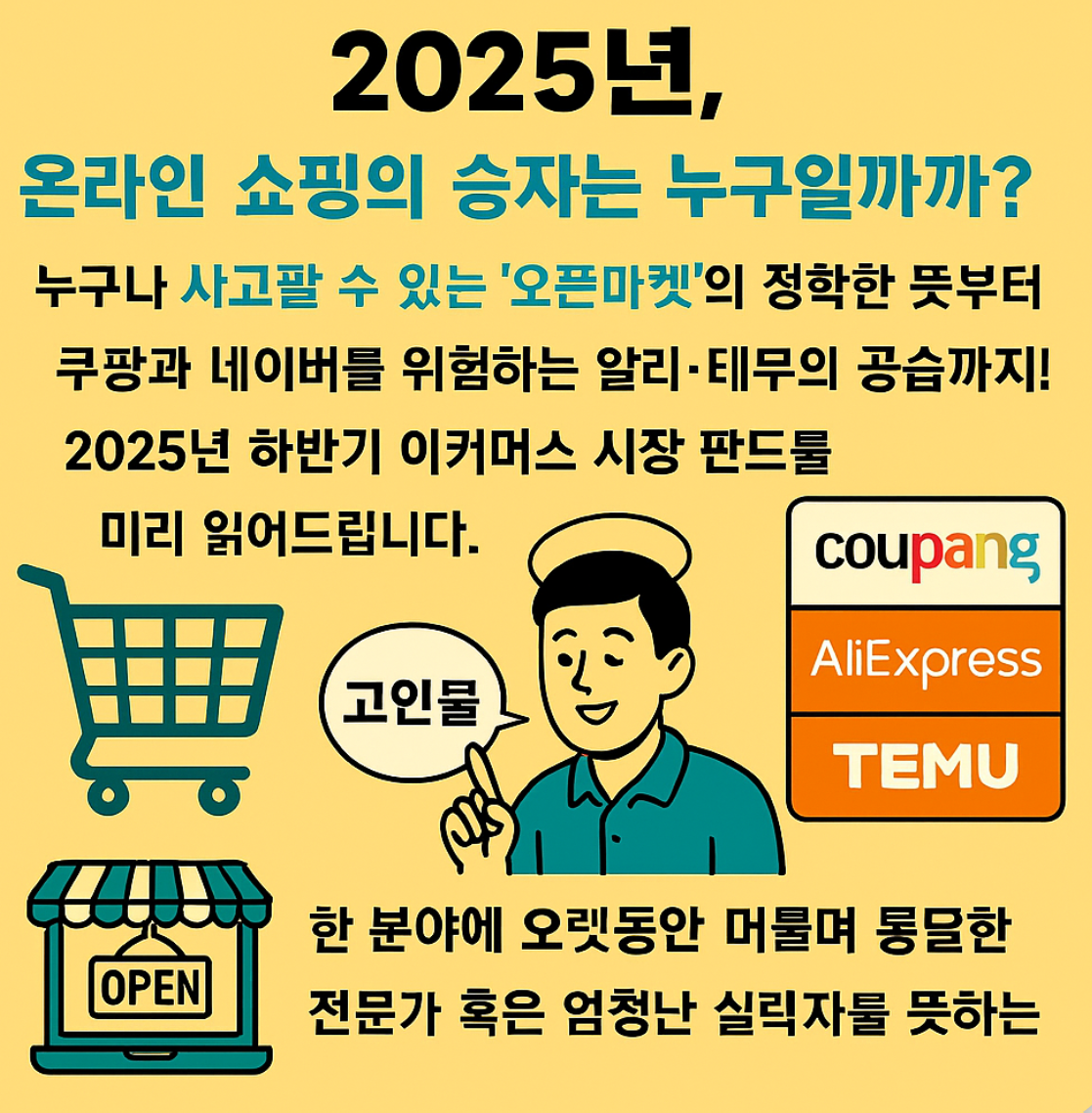 2025년 오픈마켓 시장은 그 어느 때보다 치열한 '속도'와 '가격' 전쟁이 될 것 같습니다. 소비자 입장에서는 선택지가 많아져서 즐겁지만, 판매자 입장에서는 변화하는 흐름을 놓치지 않는 게 중요하겠죠?