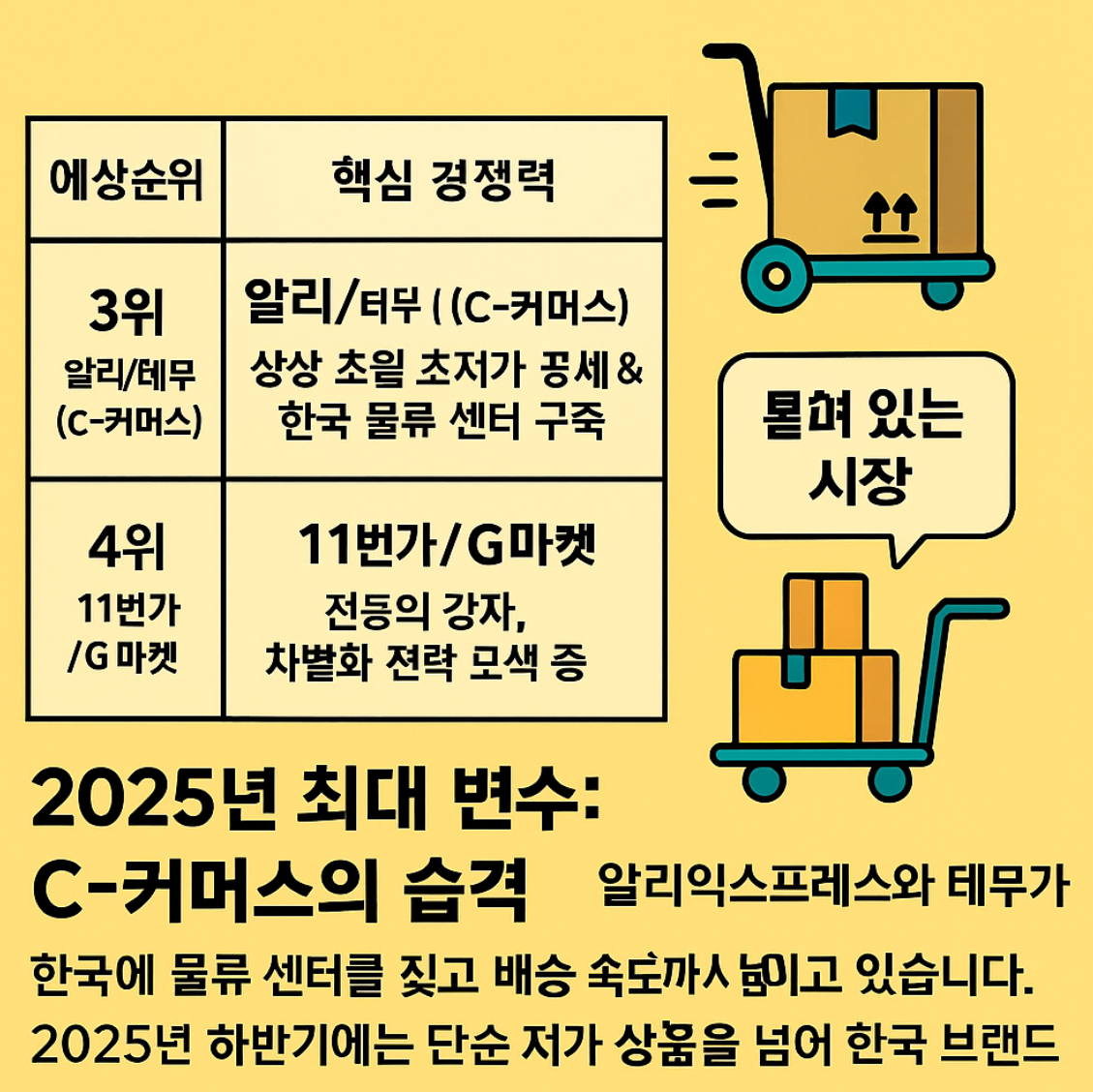| 3위 | 알리/테무 (C-커머스) | 상상 초월 초저가 공세 & 한국 물류 센터 구축 |