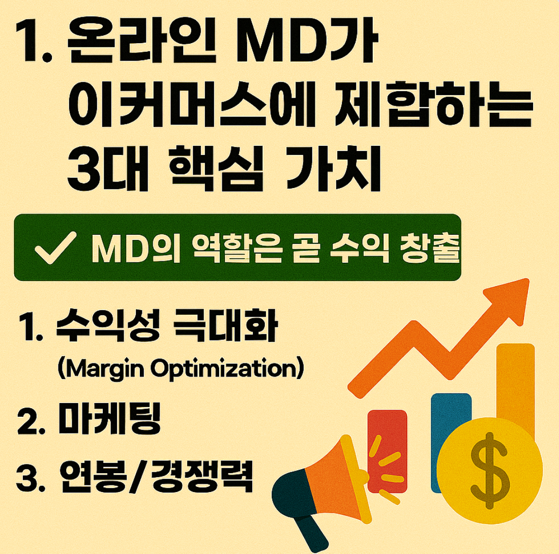 온라인 MD는 단순히 상품을 진열하는 사람이 아니라, 시장 트렌드를 읽고 고객 수요를 예측하며, 매출과 수익을 극대화하는 전략적인 전문가입니다.