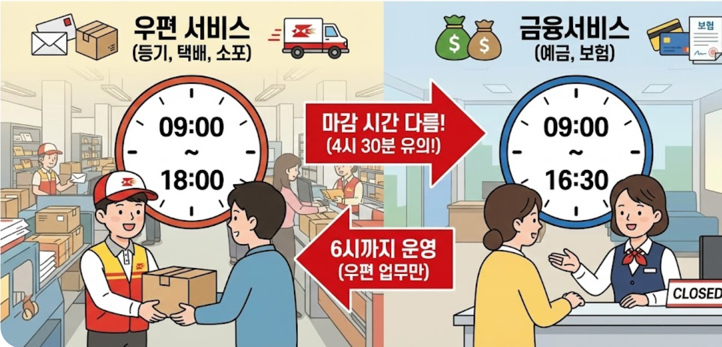 우체국은 크게 우편 서비스(등기, 택배, 소포)와 금융 서비스(예금, 보험)로 나뉩니다. 가장 중요한 점은 이 두 서비스의 마감 시간이 다르다는 사실이에요!