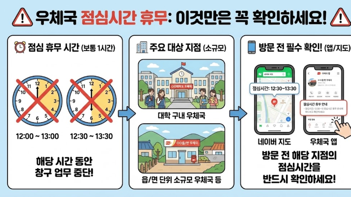 대응 방법: 방문 전 네이버 지도나 우체국 앱에서 해당 지점의 '점심시간' 안내를 반드시 확인하세요!