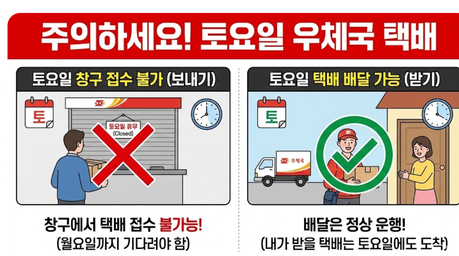 토요일에 창구 접수는 불가능하지만, 우체국 택배 배달은 정상적으로 이루어집니다. 즉, 내가 받을 택배는 토요일에도 오지만, 내가 보내고 싶은 택배를 창구에서 접수하는 건 월요일까지 기다려야 합니다.