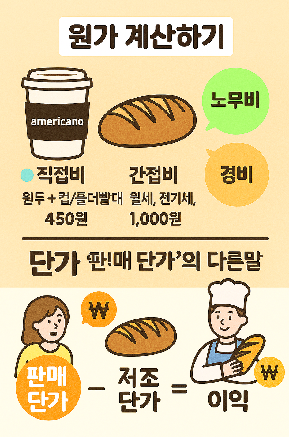 - 재료비: 제품을 만드는 데 직접 들어간 재료값 (예: 빵의 밀가루, 커피의 원두)