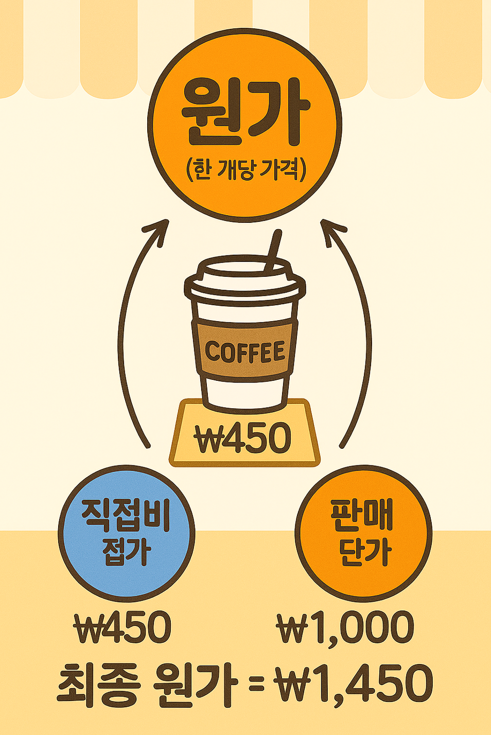 → 최종 1잔 원가 = 450원(직접비) + 1,000원(간접비) = 1,450원