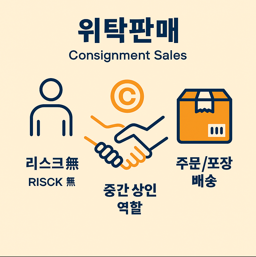 - 위탁판매 (드랍쉬핑): 재고 없음. 주문 들어오면 공급사가 배송. 리스크는 낮지만 마진도 낮음. (초보자에게 적합)