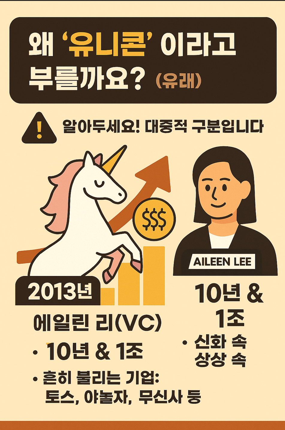 이 용어는 2013년, 미국의 유명 벤처캐피털리스트(VC)인 에일린 리(Aileen Lee)가 처음 사용했습니다. 그녀가 당시 조건을 충족하는 스타트업을 찾아보니 전 세계에 단 39개뿐이었습니다.