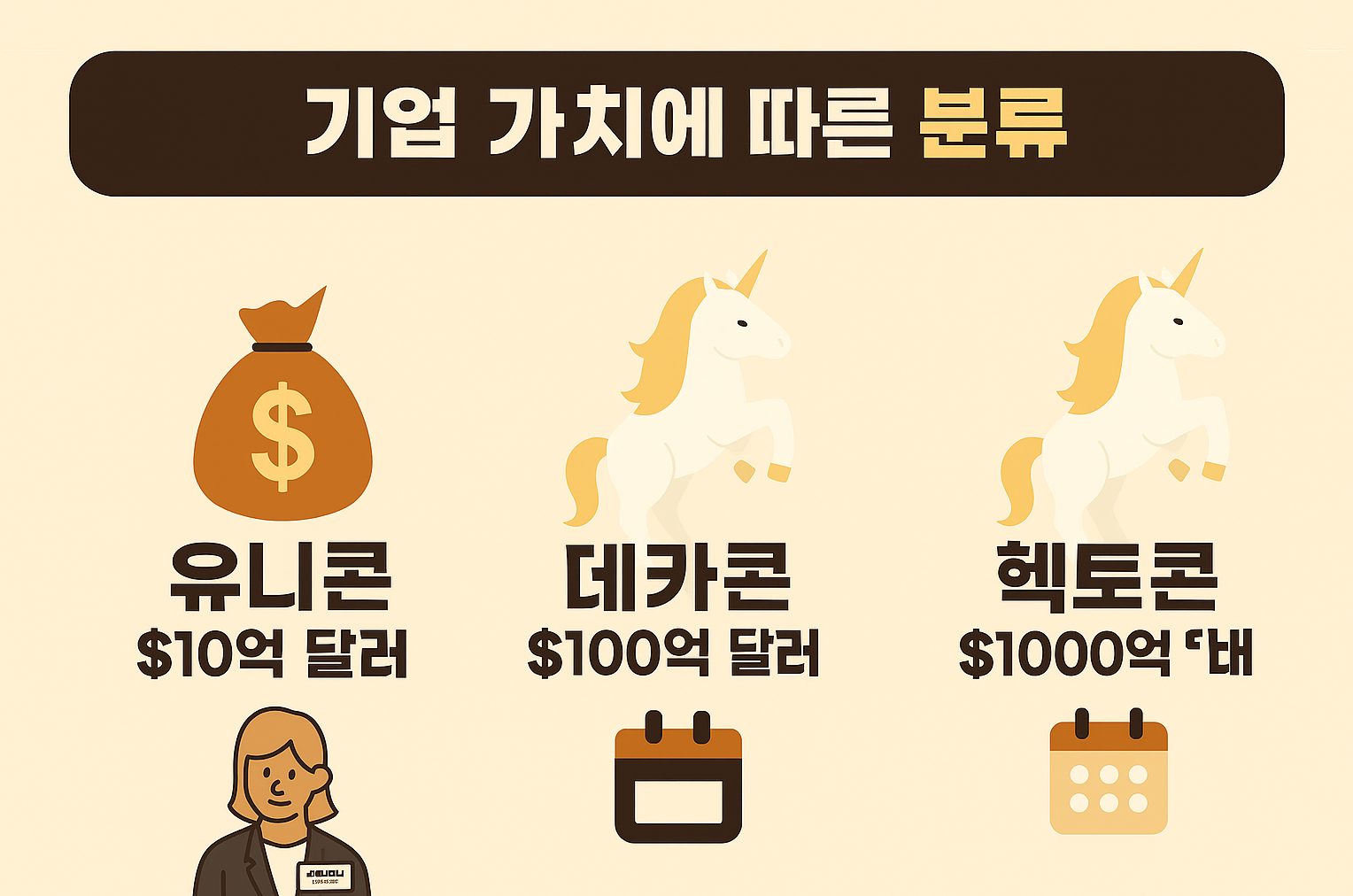- 헥토콘 (Hectocorn): '100'을 뜻하는 '헥토(Hecto)' + 유니콘. 기업 가치 1,000억 달러 (100조 원) 이상 (현재 비상장 기업 중에는 거의 없음)