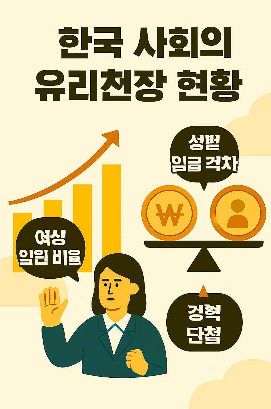 안타깝게도 많은 전문가들은 한국 사회에 여전히 두껍고 견고한 유리천장이 존재한다고 지적합니다. 여러 통계 자료들이 이러한 현실을 뒷받침하고 있는데요.