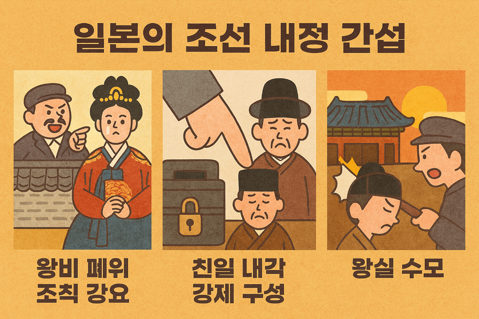 - 왕비 폐위 조칙 강요: 일본은 고종을 핍박하여 왕후가 궁궐을 탈출한 것처럼 꾸미고, 명성황후를 폐위한다는 날조된 조칙(고종의 서명도 없었음)을 내리게 했습니다.