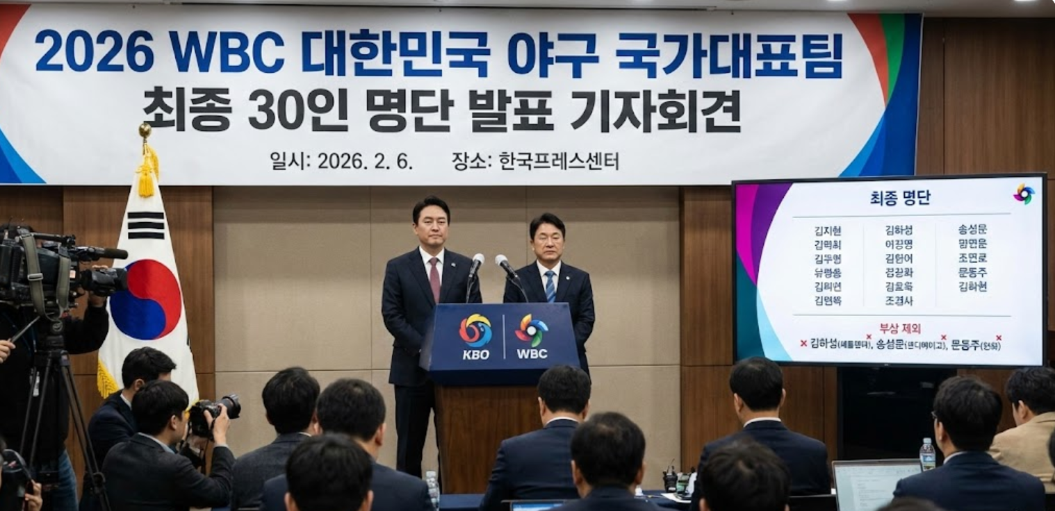 2026년 2월 6일, 드디어 오는 3월 개막하는 월드베이스볼클래식(WBC) 한국 야구 대표팀의 최종 30인 명단이 확정 발표되었습니다. 류지현 감독님과 조계현 KBO 전력강화위원장님은 서울 중구 한국프레스센터에서 기자회견을 열고, 현재 가용 가능한 최상의 전력을 꾸렸다는 자신감을 내비쳤습니다. 대표팀의 1차 목표는 명확합니다. 바로 2라운드 진출입니다.