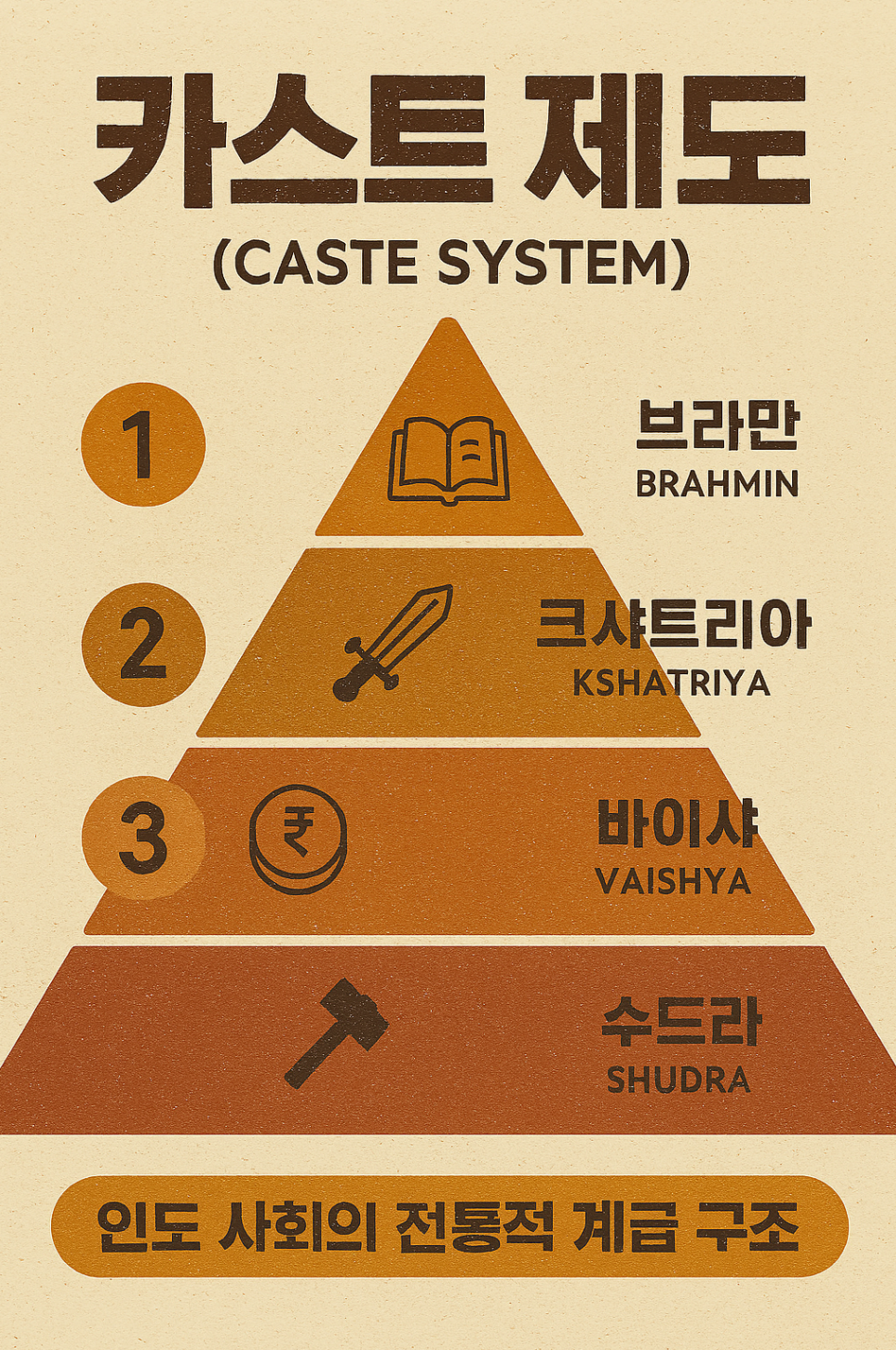 (※참고: 실제 인도는 '바르나'라는 큰 틀 아래, 직업과 지역에 따라 수천 개의 세부적인 하위 카스트인 '자티(Jati)'로 다시 나뉘어 더욱 복잡한 구조를 가집니다.)