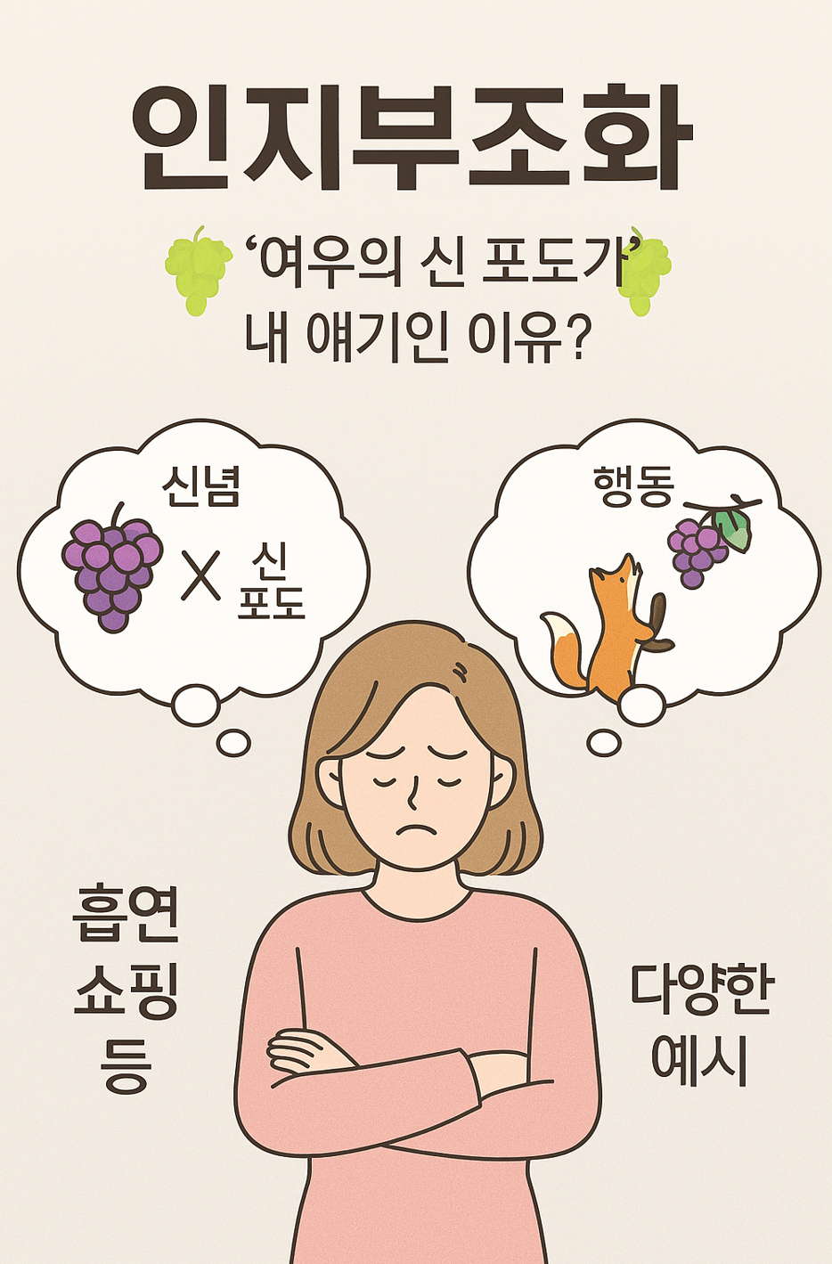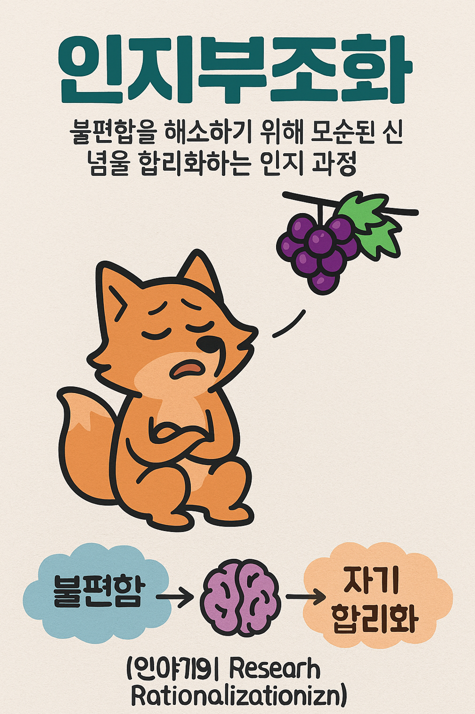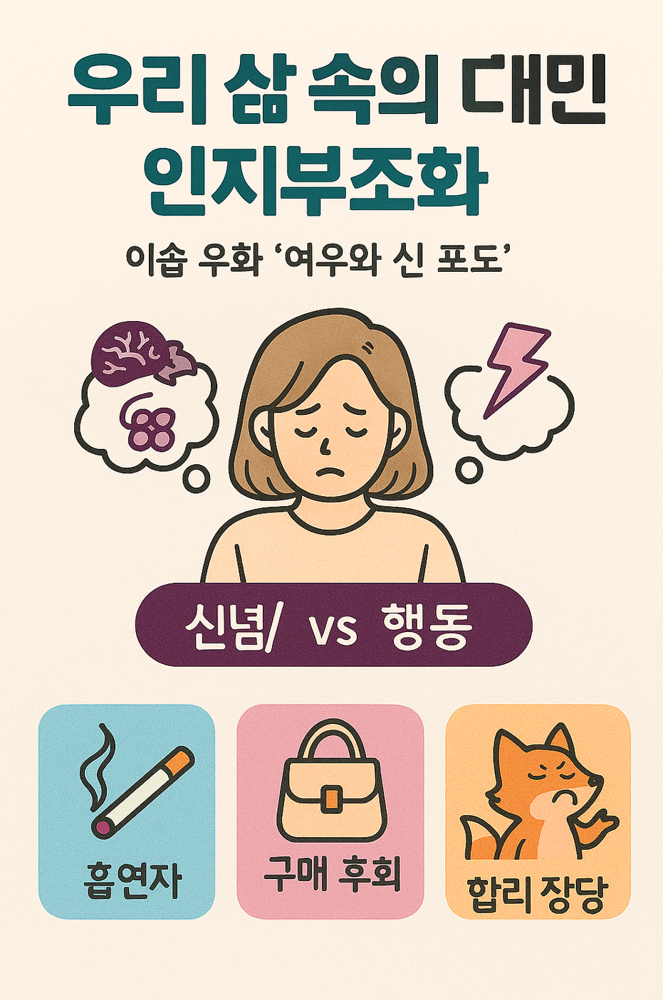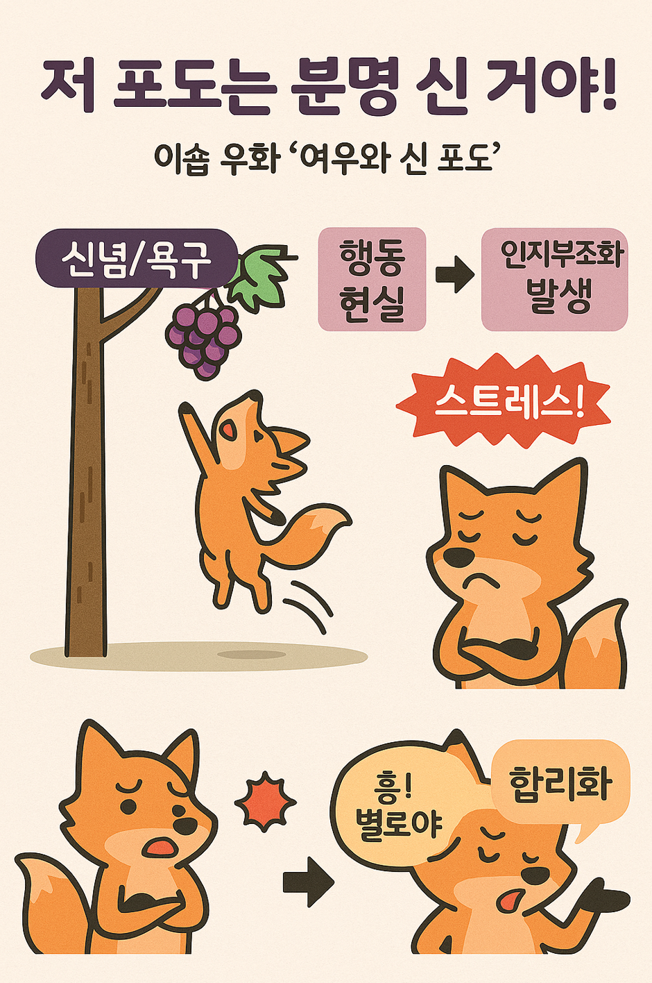 3. 인지부조화 발생 (스트레스!): "나는 저걸 원하는데(신념), 가질 수 없다(현실)." 이 모순이 여우를 불편하게 만듭니다.
