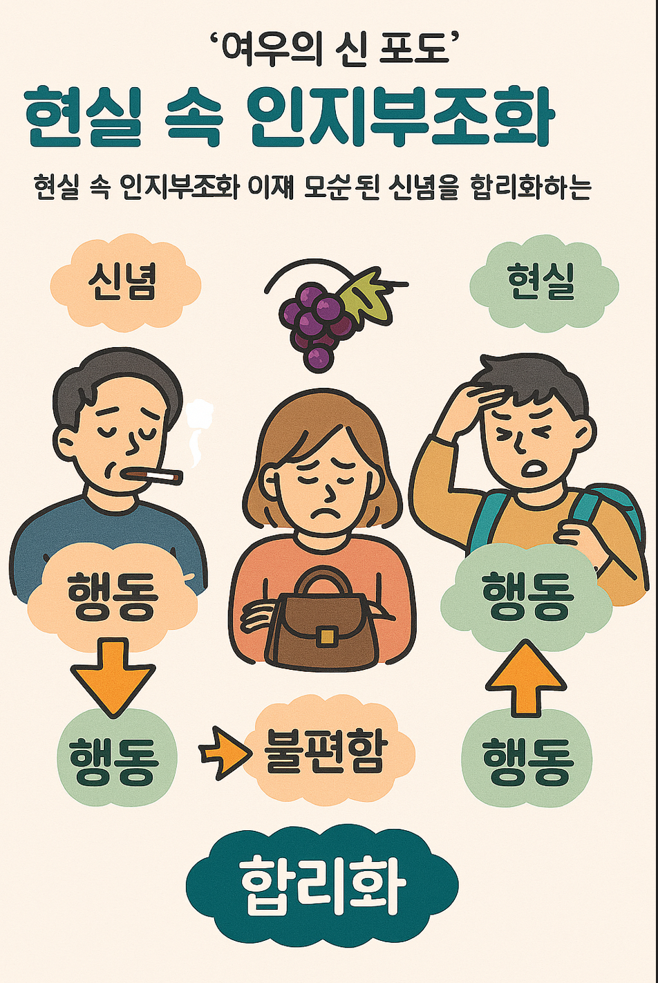 이렇게 '포도를 원한다'는 원래의 신념을 '포도를 원하지 않는다'로 왜곡함으로써, 여우는 "나는 합리적인 선택을 한 거야"라며 심리적 편안함을 되찾습니다.