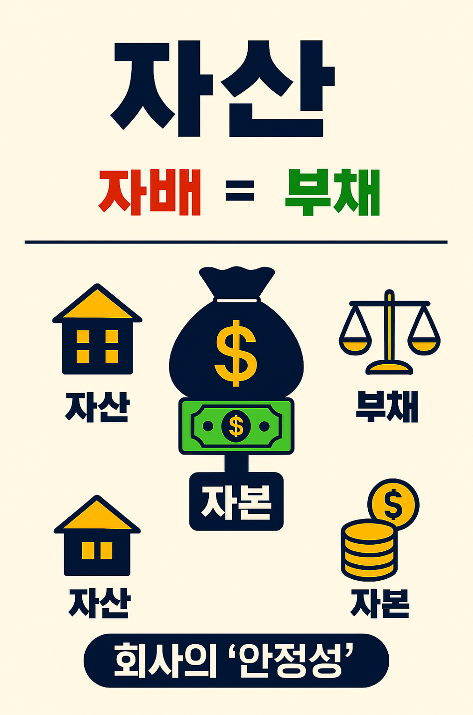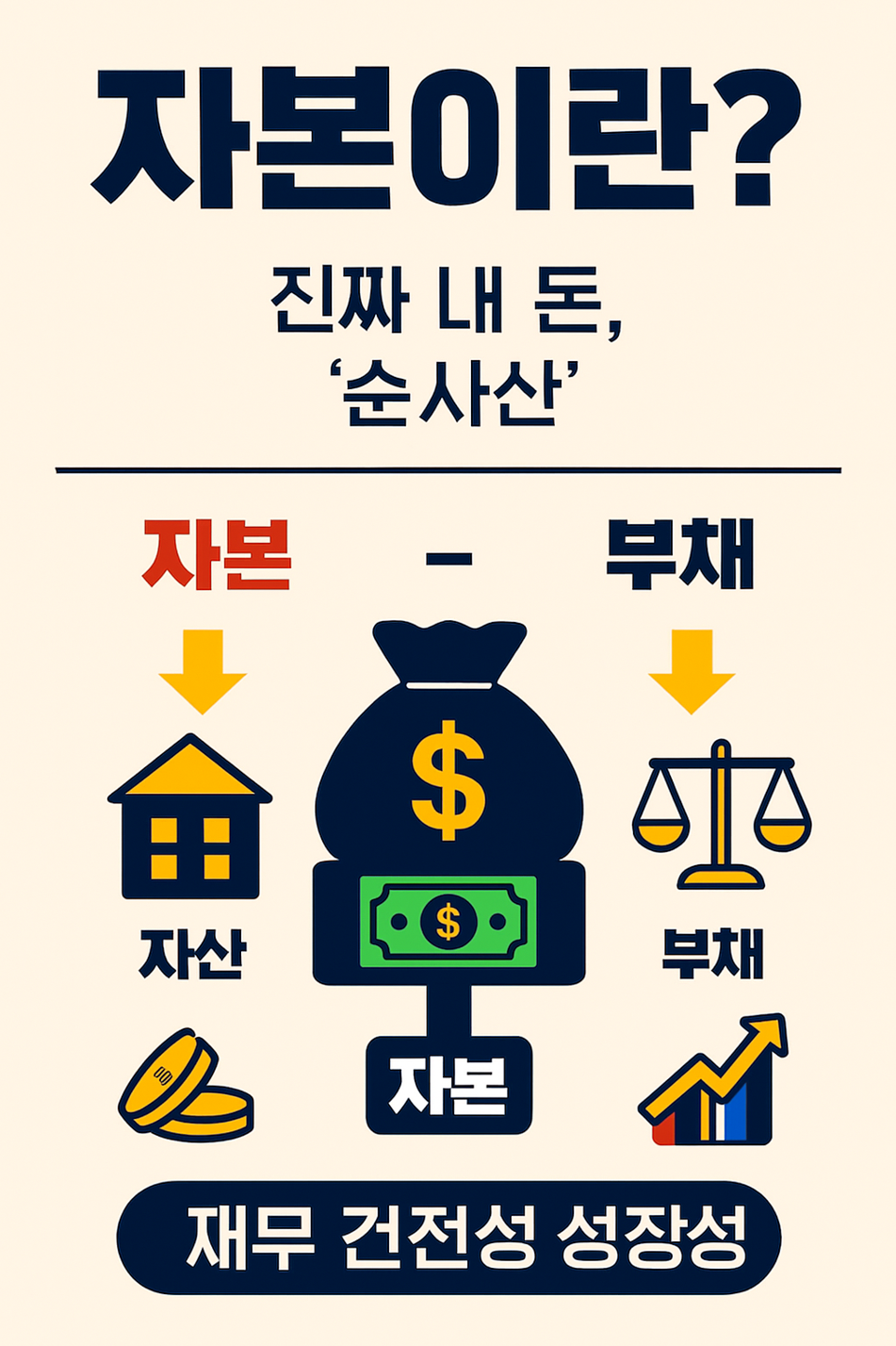 이 세 가지만 구분할 줄 알아도 회사의 덩치(자산)가 얼마나 큰지, 빚(부채)은 얼마나 있는지, 그래서 진짜 남는 돈(자본)은 얼마나 튼튼한지 파악할 수 있습니다. 투자나 이직을 고려할 때 꼭 확인해봐야 할 회사의 '건강검진표'인 셈이죠! 😊