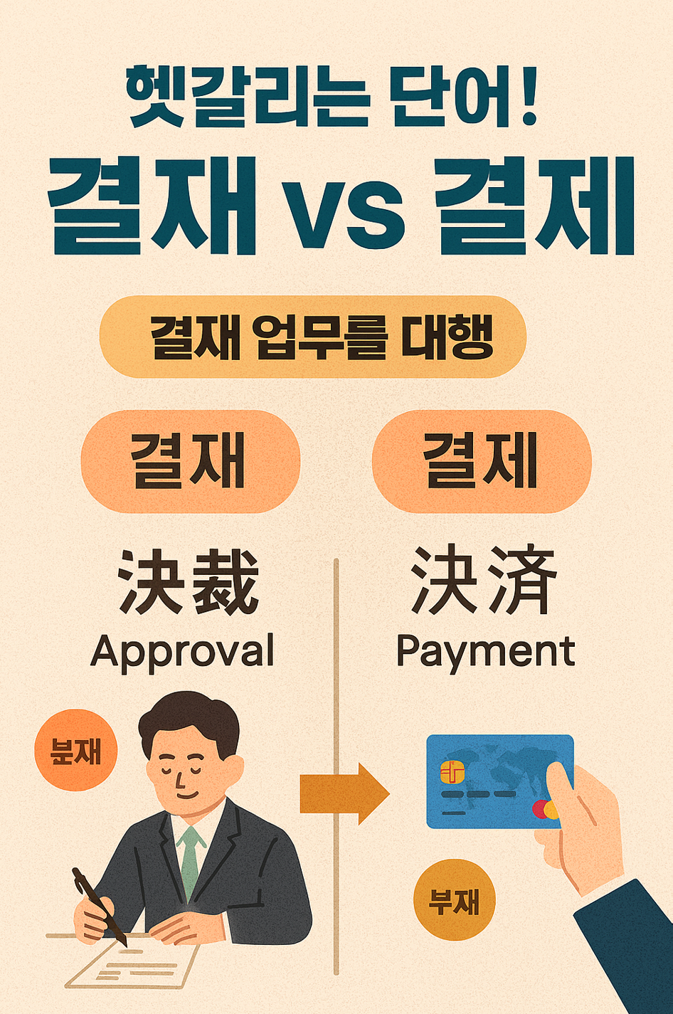- 결재 (決裁): '결정할 決'. 상사가 안건을 '승인(Approval)'하는 것. (예: "보고서 결재 올렸습니다.")