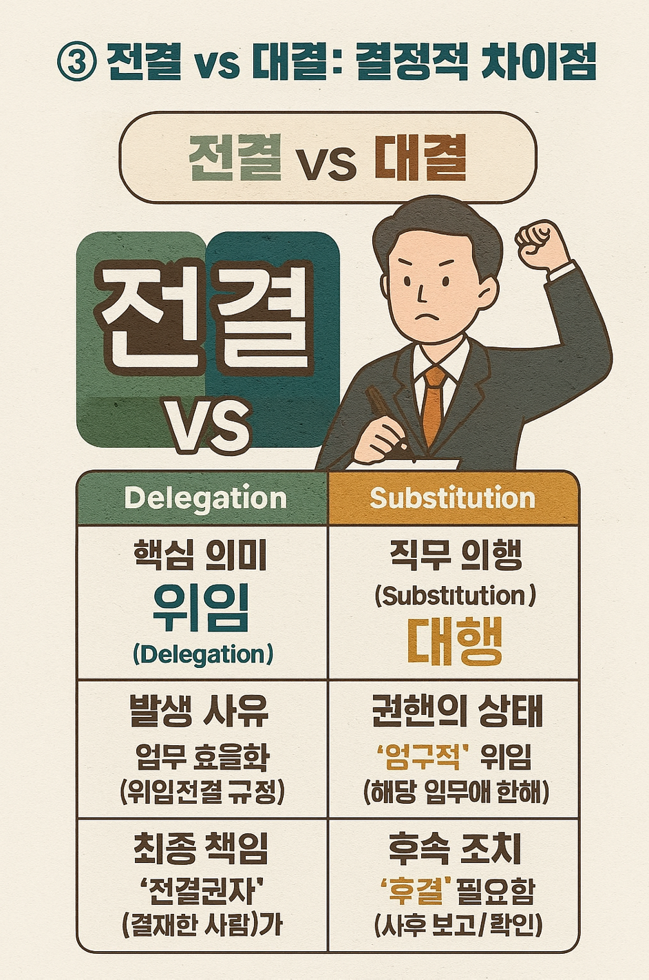| 최종 책임 | '전결권자' (결재한 사람)가 100% 짐 | '원 결재권자' (휴가 간 사람)가 짐 |