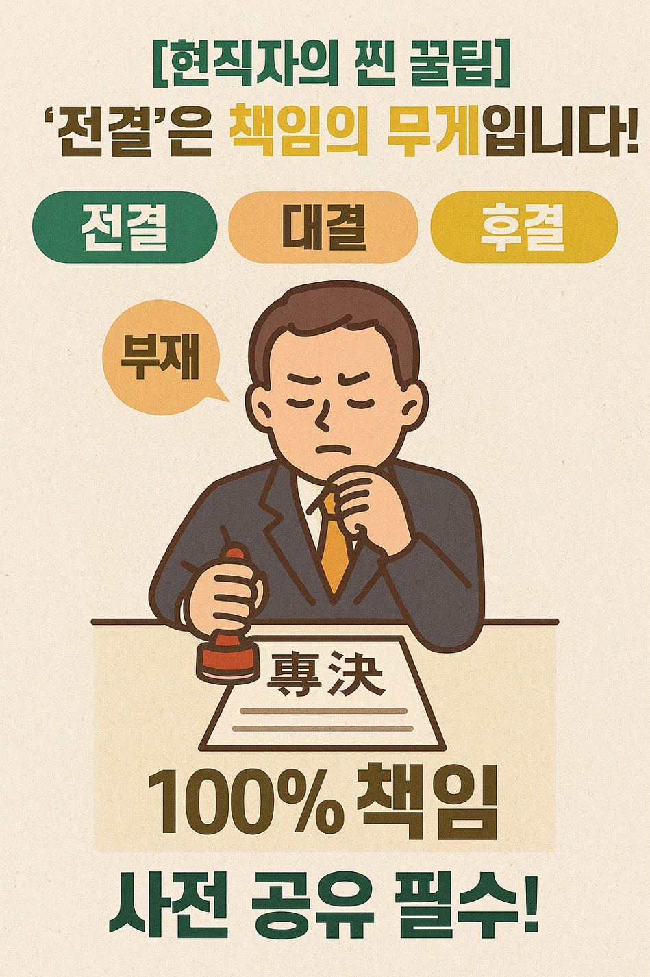 따라서 규정상 '전결' 사항이라도, 중요하거나 민감한 내용이라면 반드시 상급자(임원)에게 "이러한 건을 전결 처리하겠습니다"라고 '사전 공유'하는 것이 현명한 직장 생활의 비결입니다!