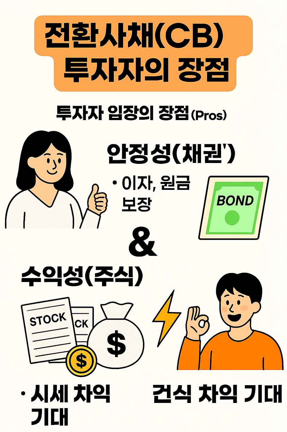 하지만 이 '전환사채(CB)'는 투자자에게는 '안정적인 이자 + 주식 대박'의 기회를, 기업에게는 '낮은 이자 + 손쉬운 자금 조달'의 문을 열어주는 아주 흥미롭고 중요한 금융 상품이랍니다.