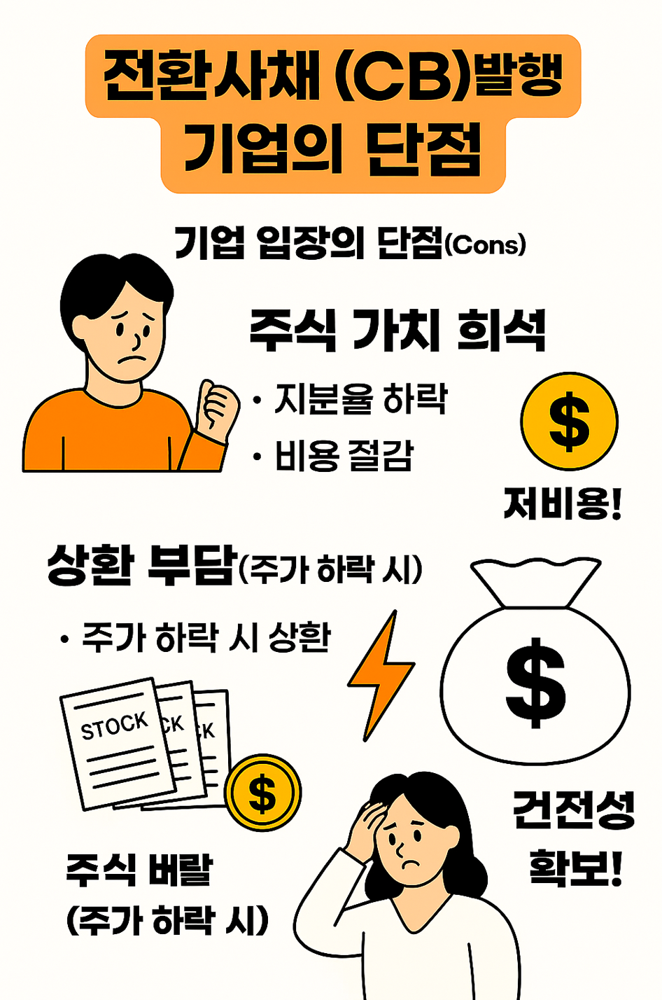 - 주식 가치 희석 (지분율 하락): 투자자들이 대거 주식으로 전환하면, 시중에 없던 주식이 새로 생겨나는 셈이므로 기존 주주들의 지분 가치가 하락(희석)할 수 있습니다. 이는 기존 주주들에게 악재로 작용할 수 있습니다.