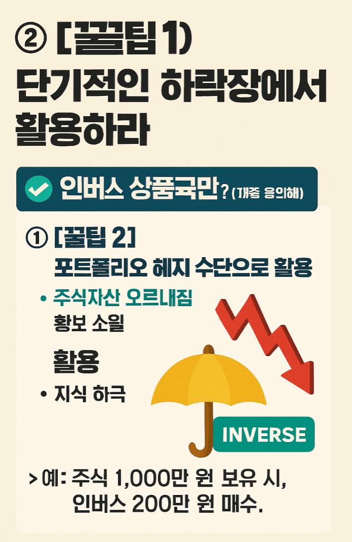- 예: 주식 1,000만 원 보유 시, 단기 하락 대비용으로 인버스 200만 원 매수. (하락 시 주식 손실을 인버스 수익으로 상쇄)