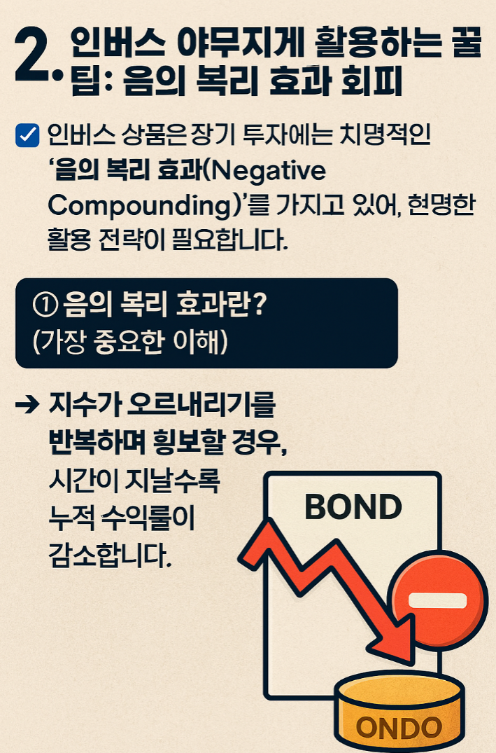 인버스 상품은 장기 투자에는 치명적인 '음의 복리 효과(Negative Compounding)'를 가지고 있어, 현명한 활용 전략이 필요합니다.