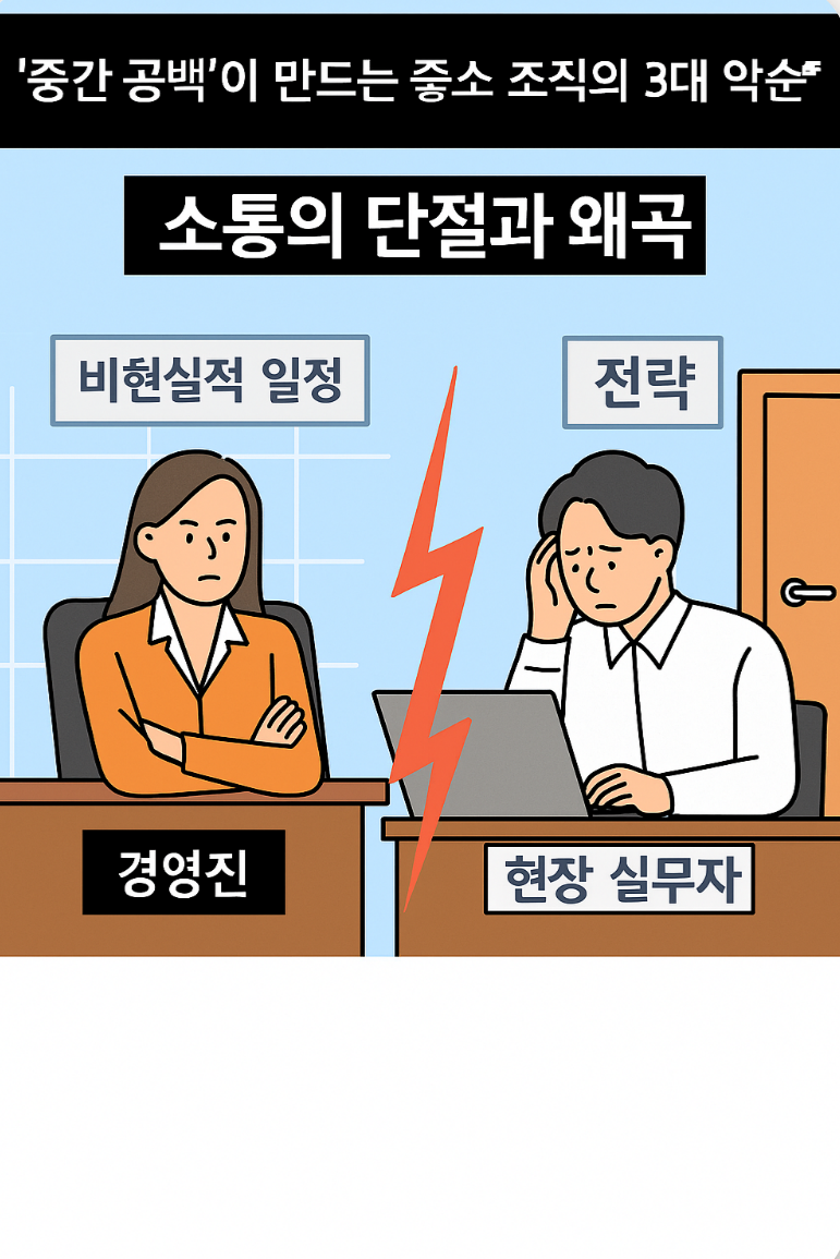 - ① 소통의 단절과 왜곡: 현장 실무의 문제점(예: 비현실적인 일정)이 중간 필터 없이 경영진에게 전달되거나, 반대로 경영진의 전략이 왜곡되어 실무에 내려와 비효율적인 업무를 야기합니다.
