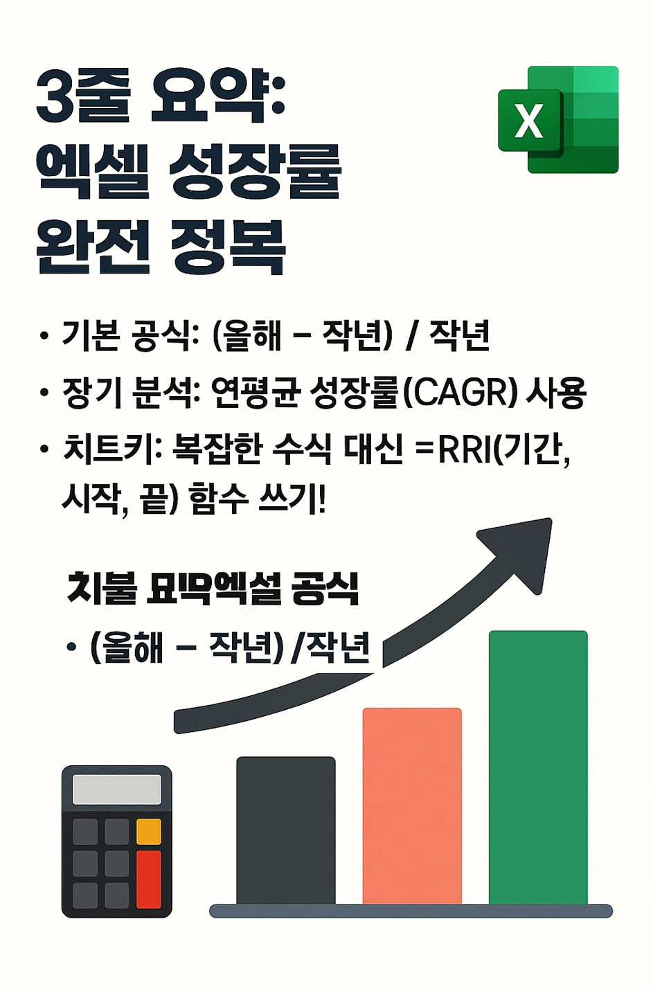 지금까지 실무에서 꼭 필요한 엑셀 성장률 계산법을 알아봤습니다. 이제 상사가 갑자기 데이터를 물어봐도 당황하지 않고 "아, 전년 대비 00% 성장했고, 연평균 성장률은 00%입니다!"라고 멋지게 대답하실 수 있겠죠?