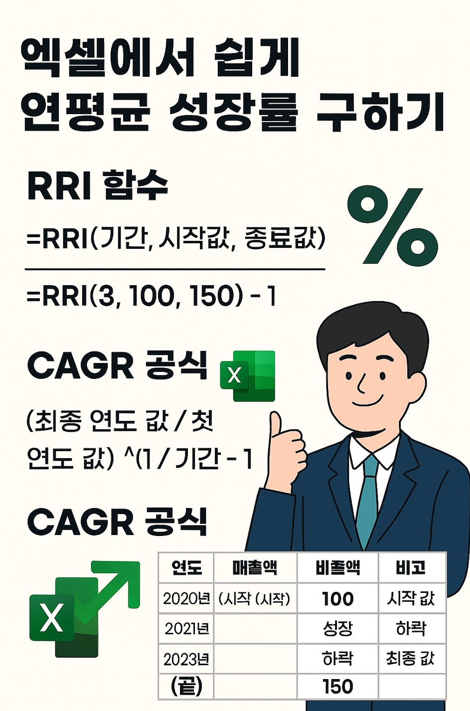 "수식이 너무 복잡해서 외우기 힘들어요!" 하시는 분들을 위해 엑셀에는 연평균 성장률 전용 함수가 숨어 있습니다. 바로 RRI 함수입니다.