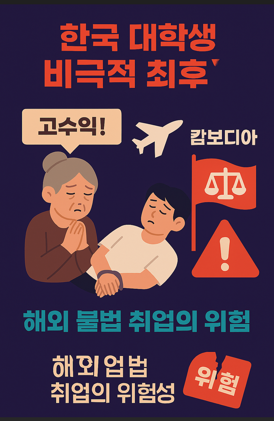 "해외 박람회에 다녀오겠다"던 22살 대학생이 74일 만에 싸늘한 유해로 돌아왔습니다. 캄보디아 현지 범죄 조직에 의해 감금·고문당해 숨진 박모 씨의 비극적인 사연 뒤에는 할머니의 병원비 등 어려운 가정 형편으로 인해 돈이 절박했던 사정이 있었다는 안타까운 보도가 이어지고 있습니다. 고수익 단기 아르바이트라는 말에 속아 대포통장 모집책에 발을 들였다가 목숨을 잃은 이 비극의 전말과, 우리 청년들을 노리는 해외 불법 취업 사기의 위험성을 자세히 알려드립니다.