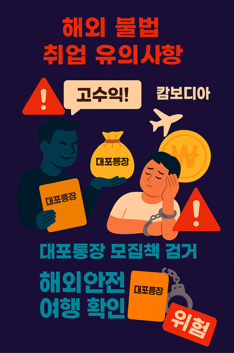고수익 미끼 주의: 고수익을 보장하면서 업무 설명이 불분명한 해외 일자리는 100% 불법 범죄에 연루될 가능성이 높습니다. 대포통장 알선은 범죄: 은행 통장을 타인에게 양도하거나 빌려주는 행위는 명백한 전자금융거래법 위반으로 형사처벌 대상입니다. 해외안전여행 확인: 해외 방문 전 외교부의 [해외안전여행 사이트](https://www.0404.go.kr) 또는 앱을 통해 방문 국가의 안전 정보를 반드시 확인하세요.