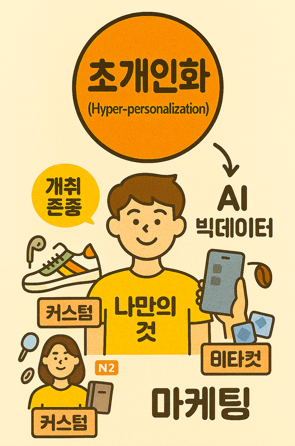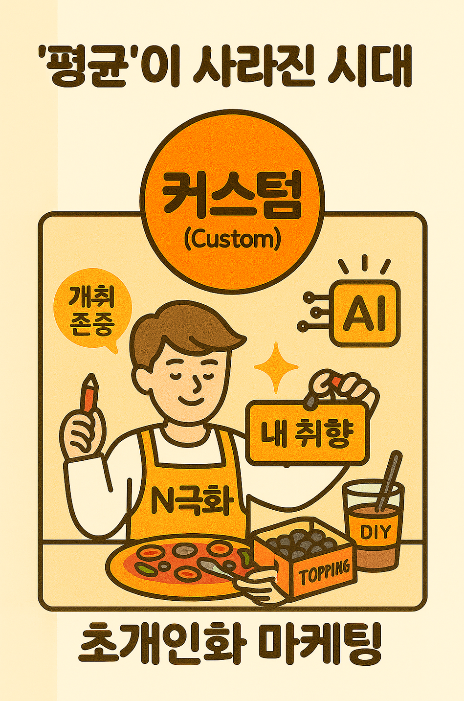 과거에는 '평균적인' 대중을 상대로 한 매스 마케팅이 통했습니다. 하지만 지금은 개인의 취향이 극도로 세분화된 'N극화 현상'이 나타나고 있습니다. '평균적인' 제품은 누구의 마음도 사로잡기 어렵게 된 것이죠. 이제는 AI와 빅데이터 기술을 활용해 한 사람 한 사람을 독립된 시장으로 보는 '초개인화' 시대가 열렸고, 커스텀은 이를 구현하는 핵심 전략입니다.