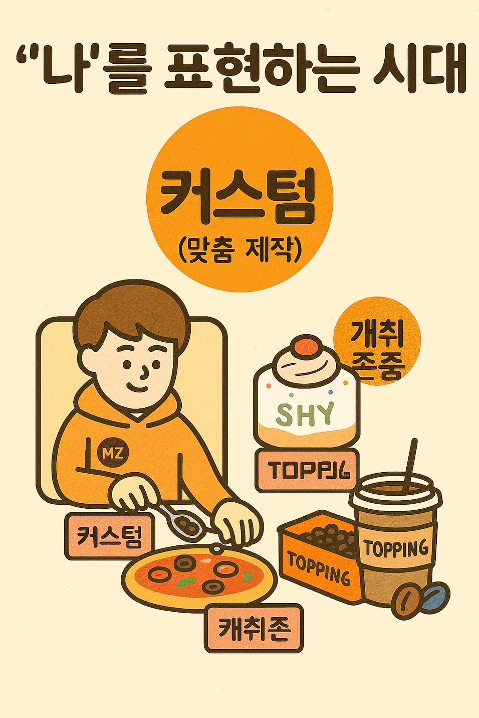 2025년 핵심 소비 트렌드 중 하나로 '토핑경제(Topping Economy)'가 꼽혔습니다. 이는 완성된 본품(예: 피자 도우)보다 그 위에 올리는 추가 옵션(예: 토핑)에 더 많은 돈을 지불하고 집중하는 현상입니다. 소비자들은 완제품을 그대로 사기보다, 자신의 취향대로 옵션을 추가하고 빼는 DIY(Do It Yourself) 과정 자체에 큰 의미를 부여합니다.