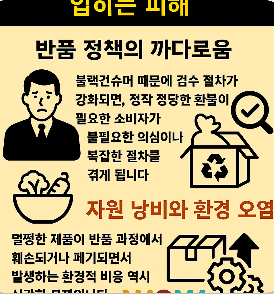- 반품 정책의 까다로움: 블랙컨슈머 때문에 검수 절차가 강화되면, 정작 정당한 환불이 필요한 소비자가 불필요한 의심이나 복잡한 절차를 겪게 됩니다.