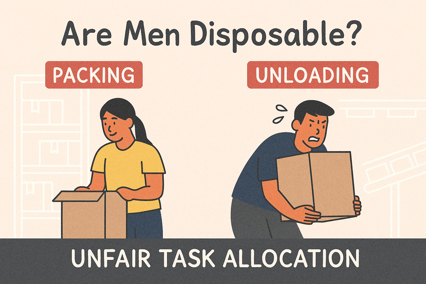 - 업무 할당: 여성은 비교적 가벼운 포장(패킹)이나 진열 업무에 배치되는 반면, 남성은 무거운 물건을 나르는 상하차(허브)나 워터(물류 지원) 등 기피 업무에 강제 배정됨.