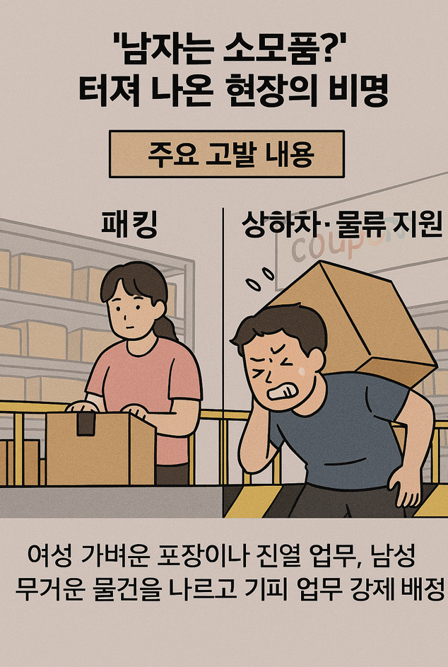 최근 직장인 익명 커뮤니티와 SNS를 중심으로 쿠팡 물류센터의 노동 강도를 고발하는 글이 잇따라 올라오며 파문이 일고 있습니다. 핵심은 "동일 임금을 받으면서 남성에게만 과도한 육체노동이 전가된다"는 것인데요.