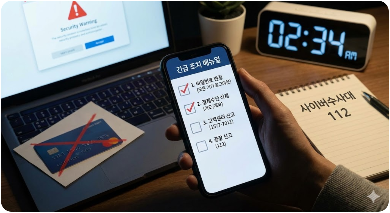 해킹이 확인되었다면 1분 1초가 급합니다. 범인이 추가 결제를 하기 전에 아래 순서대로 조치하세요.