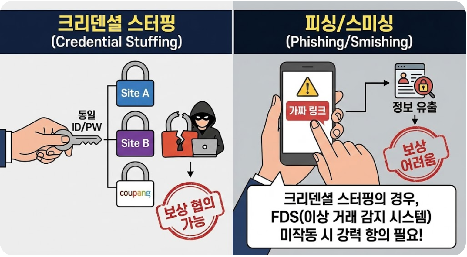 | 크리덴셜 스터핑 | 사용자가 여러 사이트에 동일한 ID/PW를 사용하다 타 사이트에서 유출된 정보로 뚫린 경우. 원칙적으로 사용자 과실이나, 쿠팡 측의 이상 감지 시스템 미작동 등이 인정되면 보상 협의 가능 |