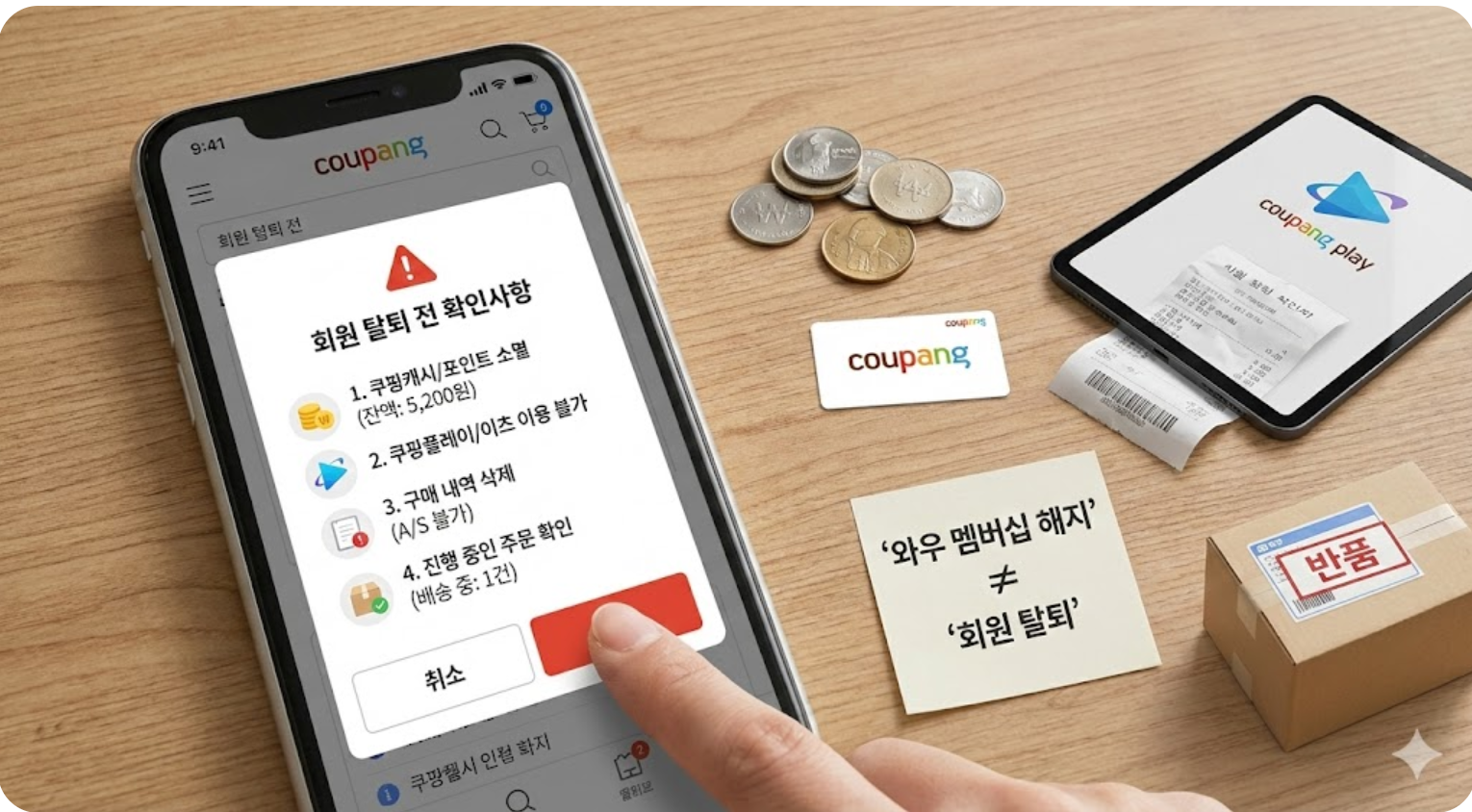 지금까지 쿠팡 탈퇴 방법과 주의사항을 알아봤습니다. 탈퇴는 개인정보 보호나 지출 관리를 위해 필요한 선택일 수 있습니다. 하지만 그에 따른 불편함(구매 이력 삭제, 서비스 이용 불가)도 따르니, '멤버십 해지'로 충분한지, '완전 탈퇴'가 필요한지 한 번 더 고민해 보시고 결정하시길 추천합니다.