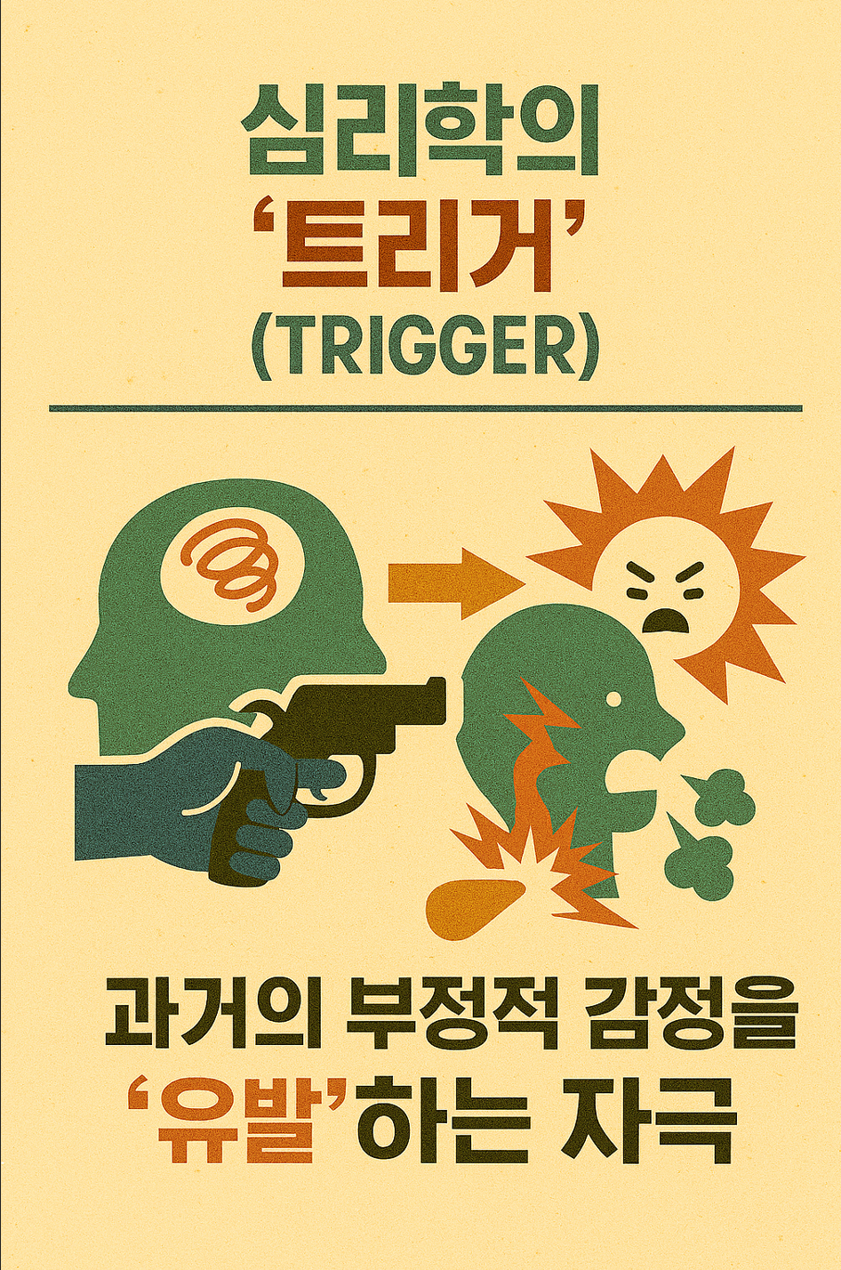 우리가 일상에서 "트리거 눌렸다"라고 말할 때의 '트리거'는 대부분 이 심리학적 의미입니다. 바로 과거의 부정적인 경험이나 트라우마와 관련된 기억, 감정(불안, 공포, 분노 등)을 다시 불러일으키는 특정 자극을 말합니다.