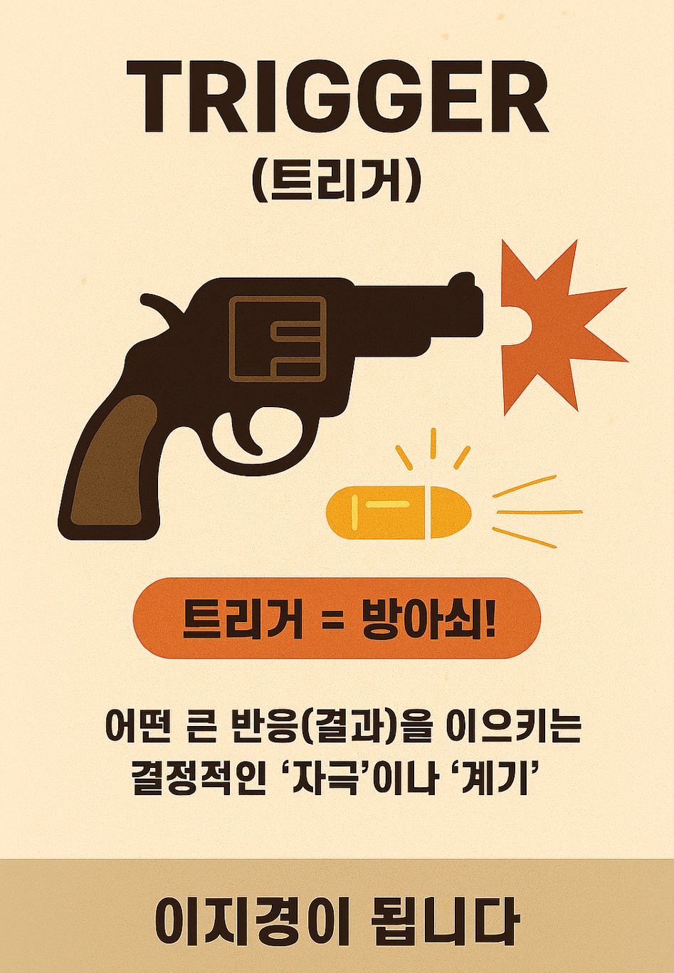 '트리거(Trigger)'의 가장 기본적이고 원래 뜻은 바로 총의 '방아쇠'입니다. 방아쇠를 당기는(Trigger) 작은 행동이 총알 발사라는 큰 결과(반응)를 일으키죠.