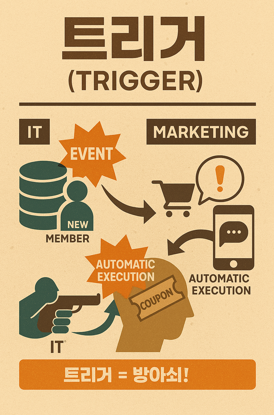 - 사례: 쇼핑몰 DB에 '신규 회원 가입'(트리거) 이벤트가 발생하면, '가입 축하 쿠폰 발송'(자동 실행) 작업이 작동하도록 설정하는 것.