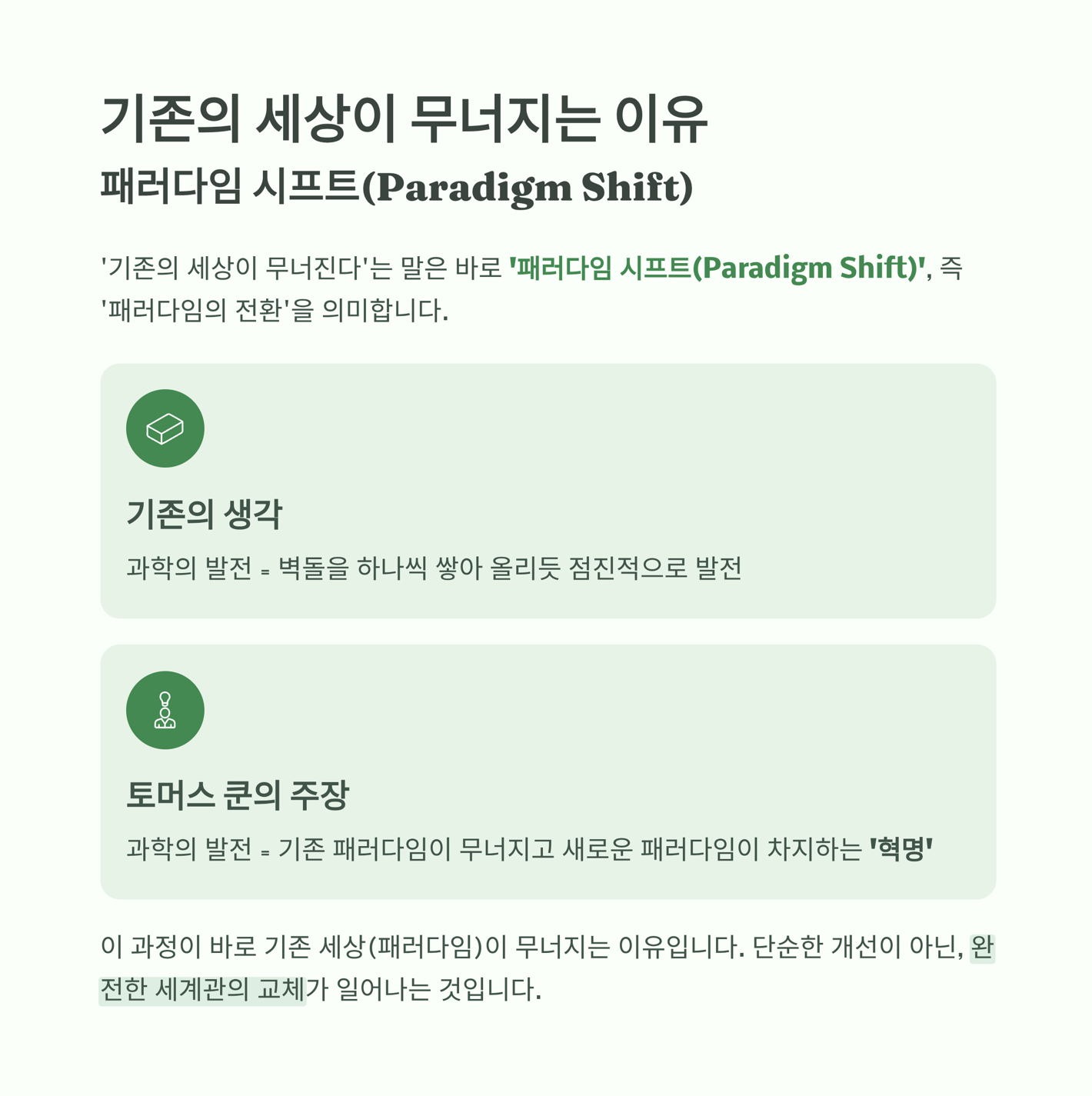 '기존의 세상이 무너진다'는 말은 바로 '패러다임 시프트(Paradigm Shift)', 즉 '패러다임의 전환'을 의미합니다. 토머스 쿤은 과학의 발전이 벽돌을 하나씩 쌓아 올리듯 점진적으로 이루어지는 것이 아니라, 기존의 패러다임이 무너지고 새로운 패러다임이 그 자리를 차지하는 '혁명'을 통해 이루어진다고 주장했습니다.