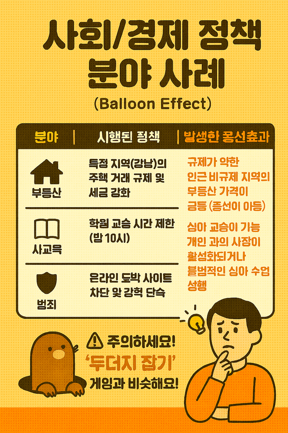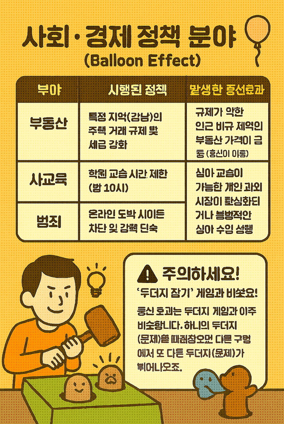 | 부동산 | 특정 지역(강남)의 주택 거래 규제 및 세금 강화 | 규제가 약한 인근 비규제 지역의 부동산 가격이 급등 (풍선이 이동) |